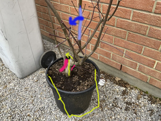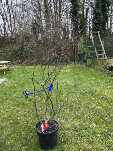 Ce redressement va mieux orienter les branches et les équilibrer presque. Restera que la branche que j’ai marquée en bleu clair viendra encore trop au centre, je préconise de la tirer en arrière vers l’extérieur avec un lien attaché à un petit piquet. (le faire après la plantation).