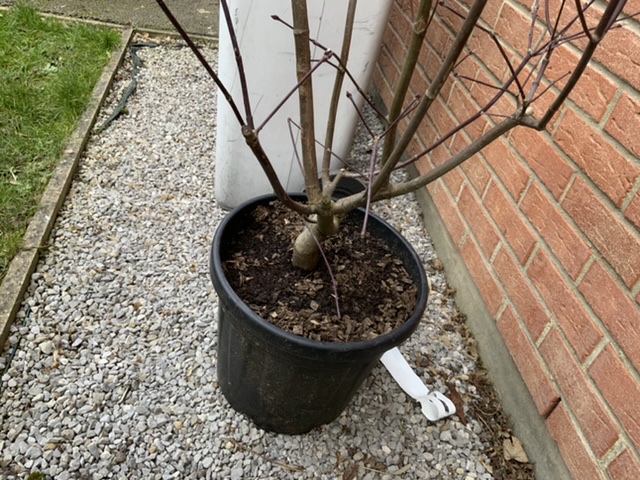 Puis, écarter les 2 branches principales avec un lien attaché à un petit piquet planté dans le sol (trait bleu sur la photo jointe).