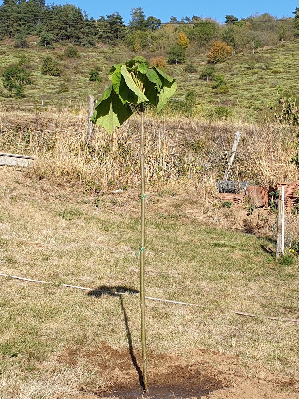 Je suis curieux de savoir si ce paulownia va se montrer très vigoureux dans sa croissance... j'ai vu ce qu'une tige non lignifiée peut donner en quelques mois seulement, mais là il s'agit déjà d'un arbre avec un tronc assez épais (18-20 cm de circonférence à 1m), mais peu de branches et de feuilles au sommet… A suivre !