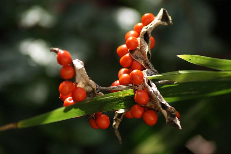 A cette époque, toute tâche de couleur est bienvenue au jardin: ici, les baies de l'iris foetedissima.