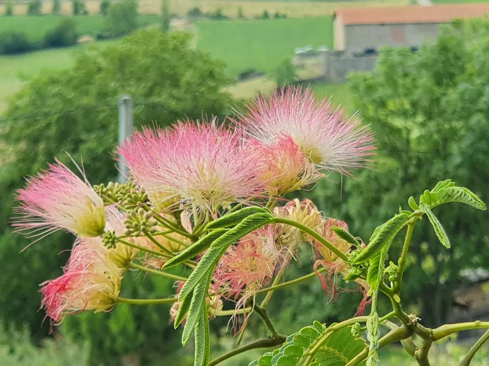 ici ça reste plus banal, l'albizzia est en fleurs (beaucoup cette année), Tamaris Pink cascade planté au printemps commence aussi et bien sûre les hibiscus