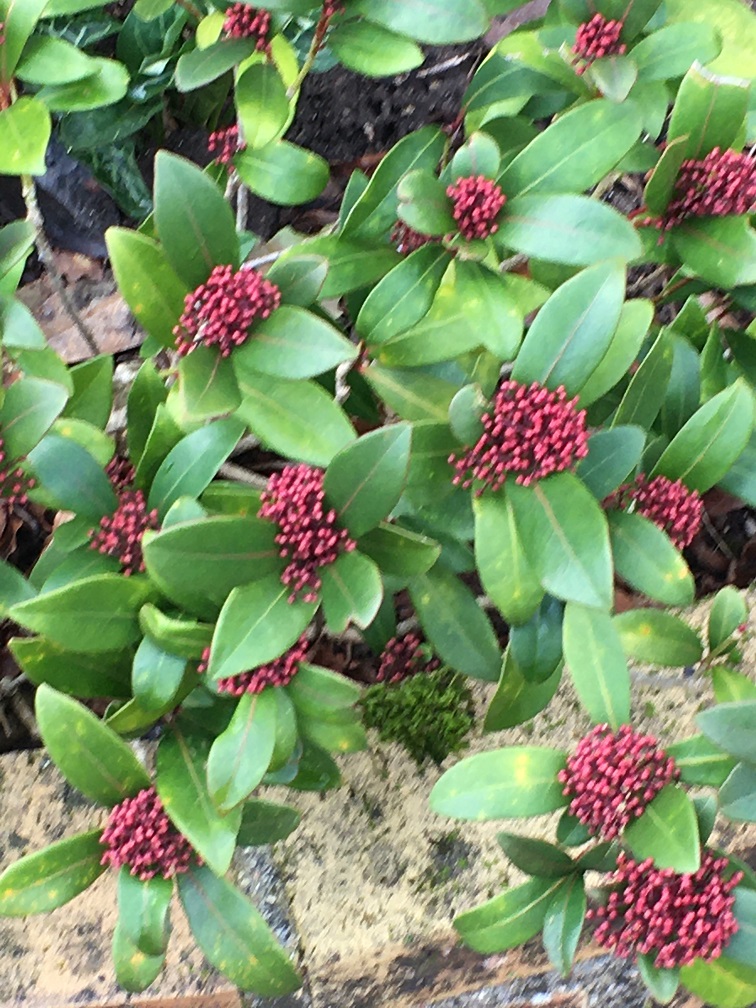 Le Skimmia Japonica qui se développe enfin et qui met un peu de couleur !!