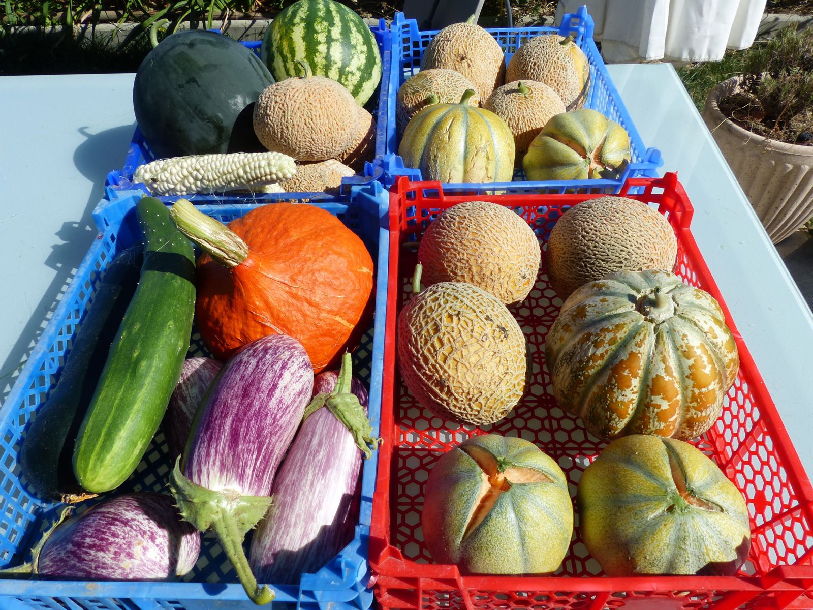 Je n'ai pas compté le nombre de kilos total, mais je devrais être à un peu moins de 200 kgs sur melon et 70 kilos sur pastéques. C'est moins que les années précédentes mais j'ai moins de plants.