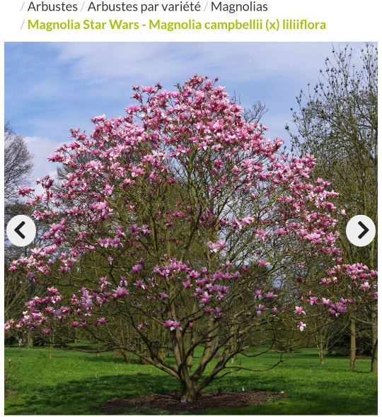 - Magnolia Star Wars, indiqué pour 3m de haut et 2,5m d'envergure. Apparamment ses racines ne sont pas dabgereuses pour les fondations