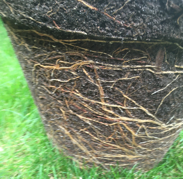 En rempotant tous les ans, on ne réduit pas les racines. On commence à le faire en rempotant tous les 2 ans; avec un cutter, on fait 4 ou 5 incisions peu profondes verticales sur l’extérieur de la motte et on supprime la galette de racines enchevêtrées au fond du pot.