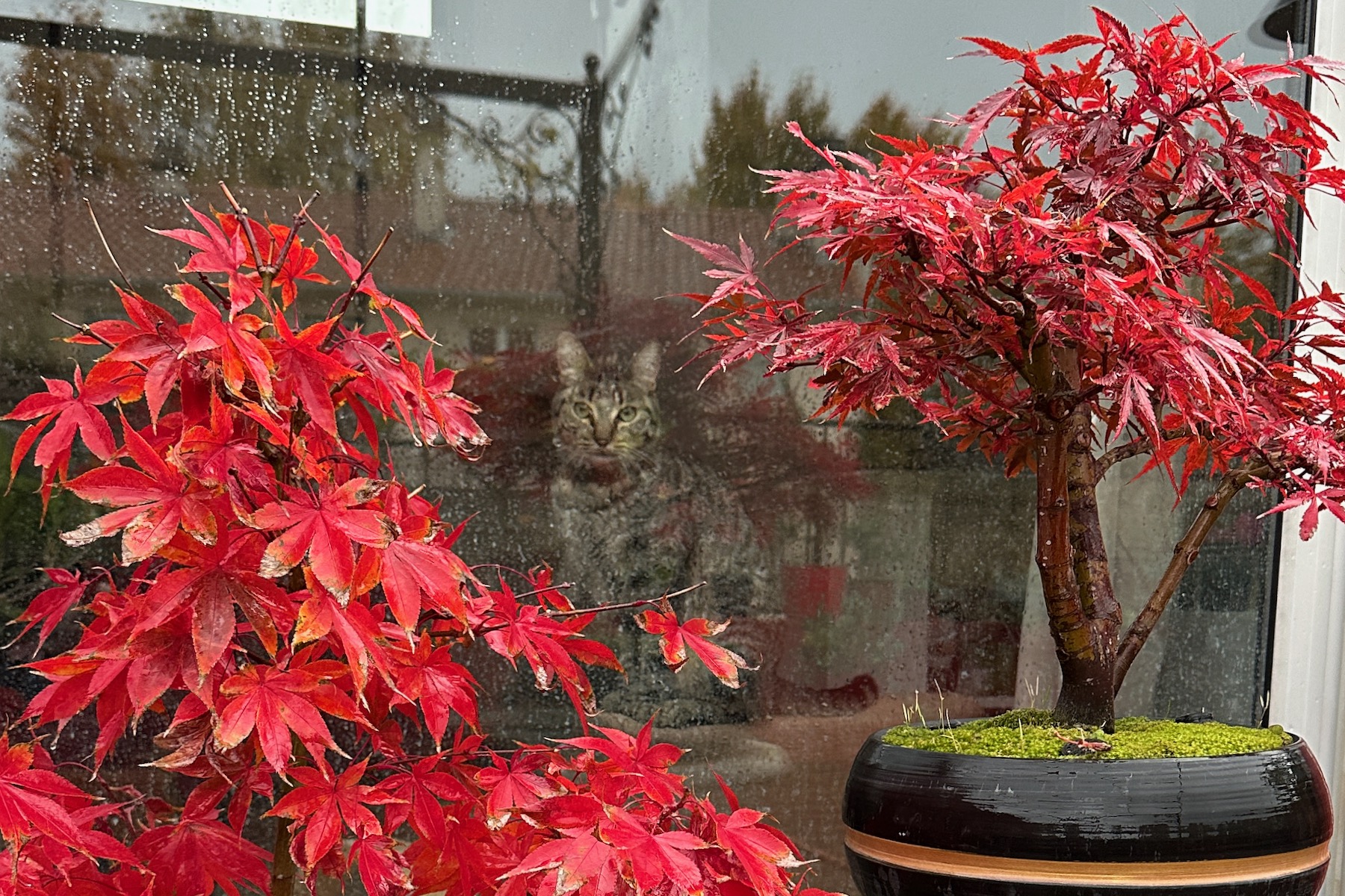 De mon coté, mon chat départage Osakazuki (à gauche) et Shaina (à droite) pour le plus beau rouge automnale sur ma terrasse.
