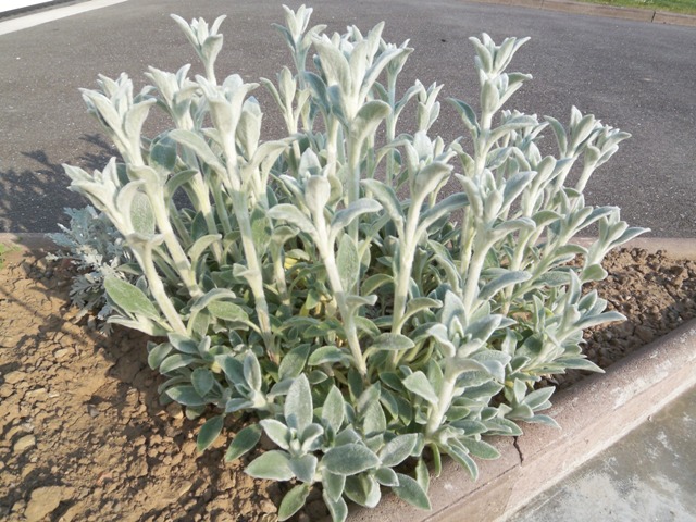 On dirait de l'oreille d'ours, qui fait d'ailleurs de fleurs violette. Stachys lanata.