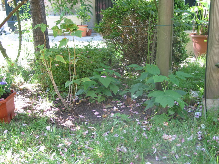 J'ai aussi replanter mon petit plan de figuier dans un grand pot et mon petit cassis près des framboisiers que j'ai protégé avec un bac de fleur contre la tondeuse de mon m. qui n'arrêtait pas de me les ratiboiser