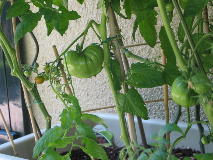 Si tu regardes mon bac de tomates, tu verra au fond le coin de la maison qui donne sur la rue et après le coin il y a le jardin d'aromates