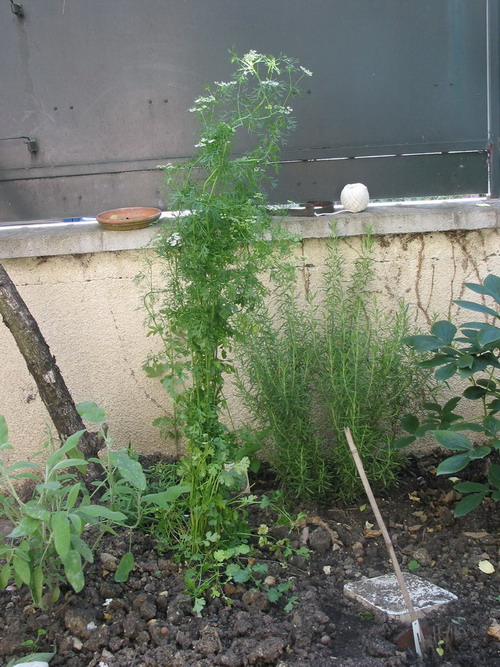 J'ai aussi commencé à replanter un peu au hasard 4 petits plans d'aromates que je déplacerais plus tard lorsque j'aurais trouver l'instalation idéale pour eux. Je ne peux pas les laisser dans les petits godets ....