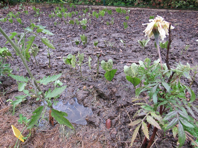 Tout cela a du mal à pousser,et l'on voit bien toute l'eau qu'il y a maintenant en permanence dans l'allée et qui recouvre les haricots lors des orages