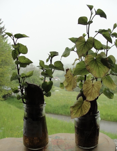 22 mars : j'ai mis deux patates douces à germer elles ont germé, une à l'endroit, une à l'envers