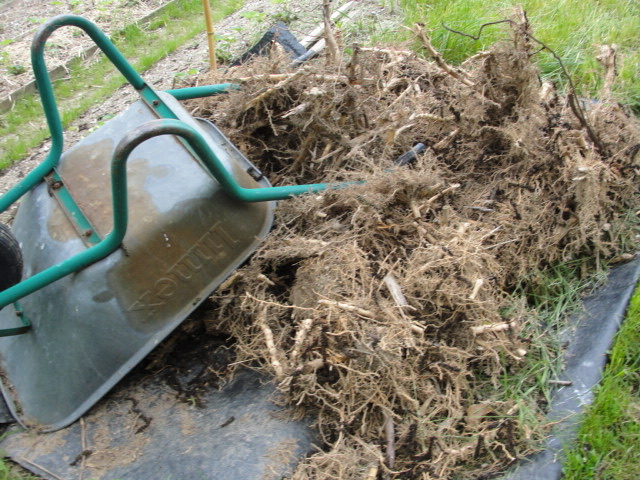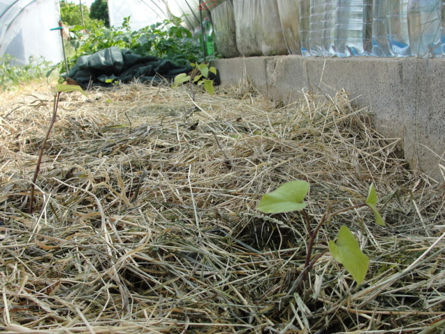 Tout arracher ! bien arroser la surface (20 litres/m2) ! remettre en place la couverture de foin ! planter les 9 patates douces !