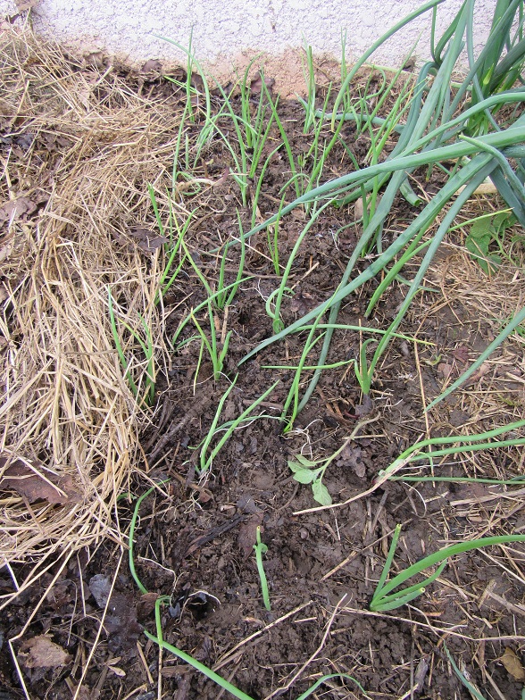 J'ai dégager une petite bande de terre à coté des oignons blanc (dont nous avons d’ailleurs commencer à en manger quelques uns). J'ai simplement retirer la couverture hivernale de foin et feuilles mortes à l'aide du râteau. Les oignons ont été planté tous les 10 cm environ, à l'aide d'un morceau de bois afin de faire un avant trou.