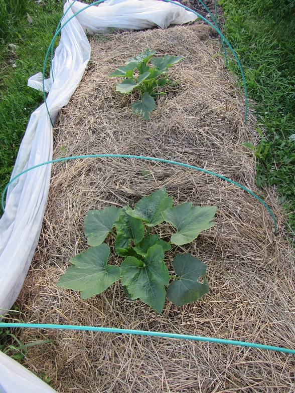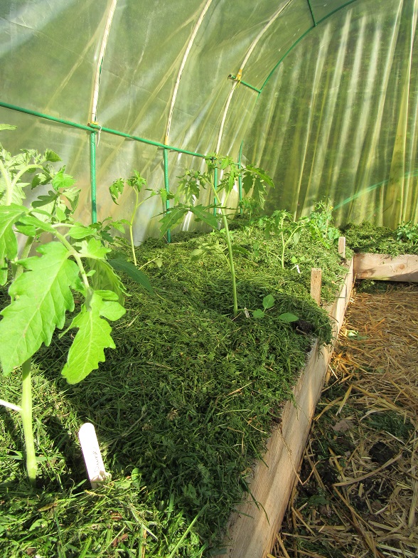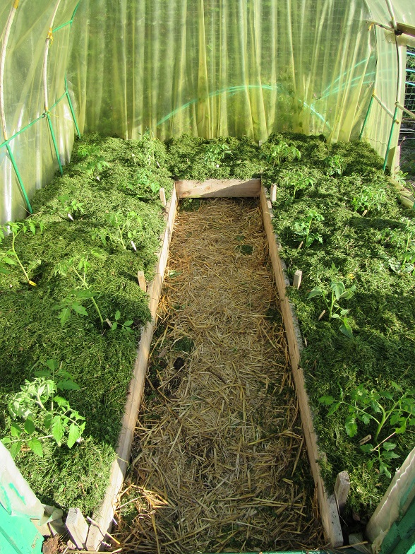 Une fois planté, j'ai à nouveau paillé mais avec des tontes de gazon toutes fraiches. Le foin retiré précédemment a eu une autre utilité...