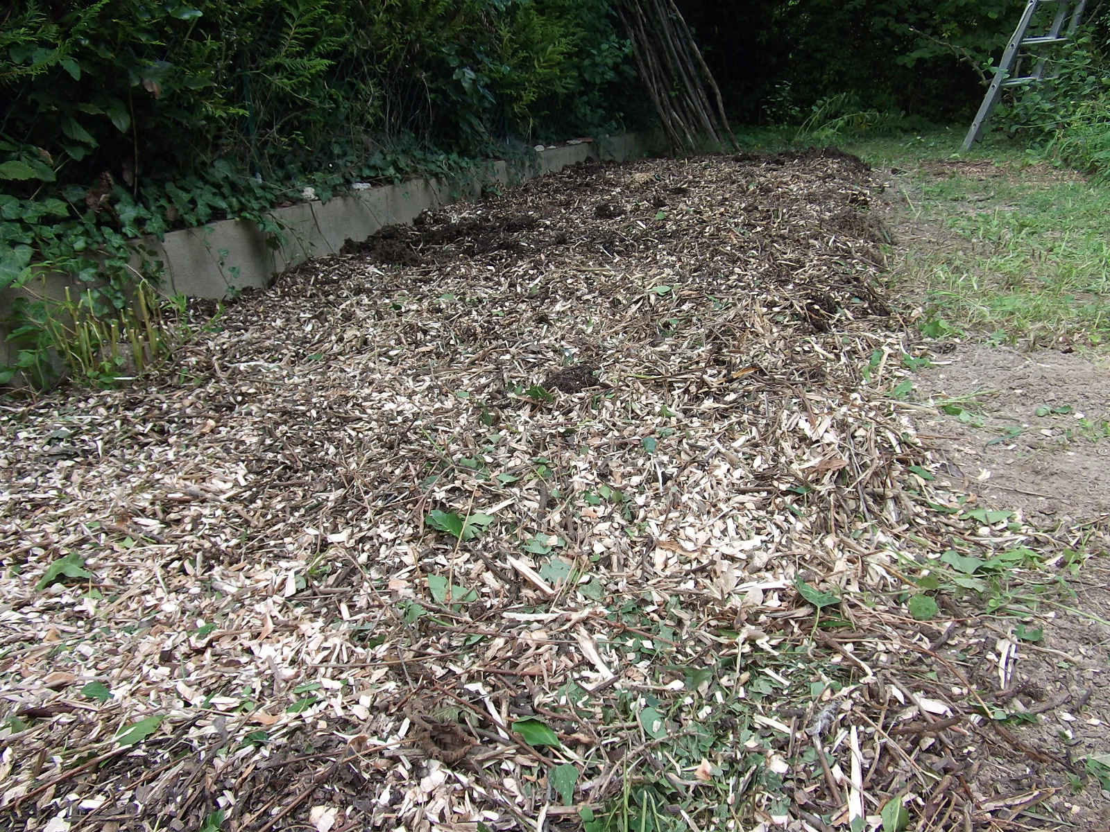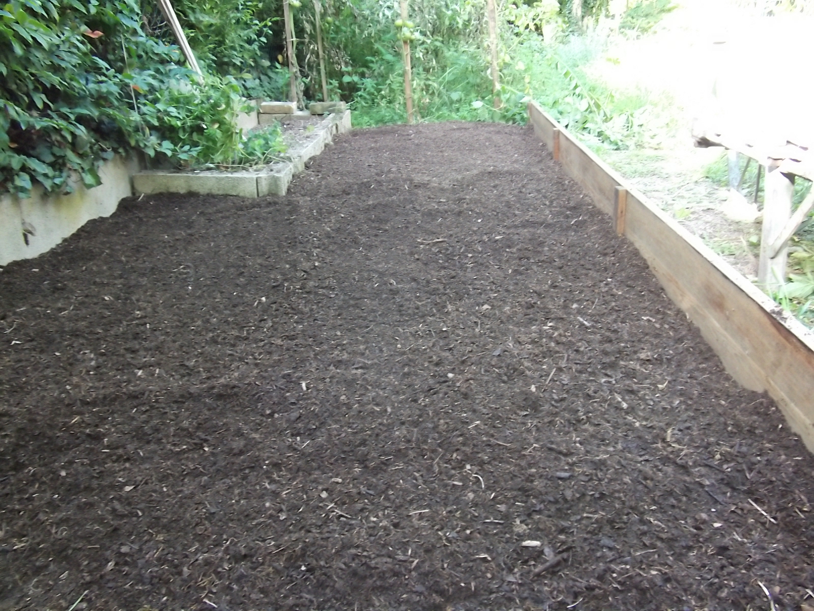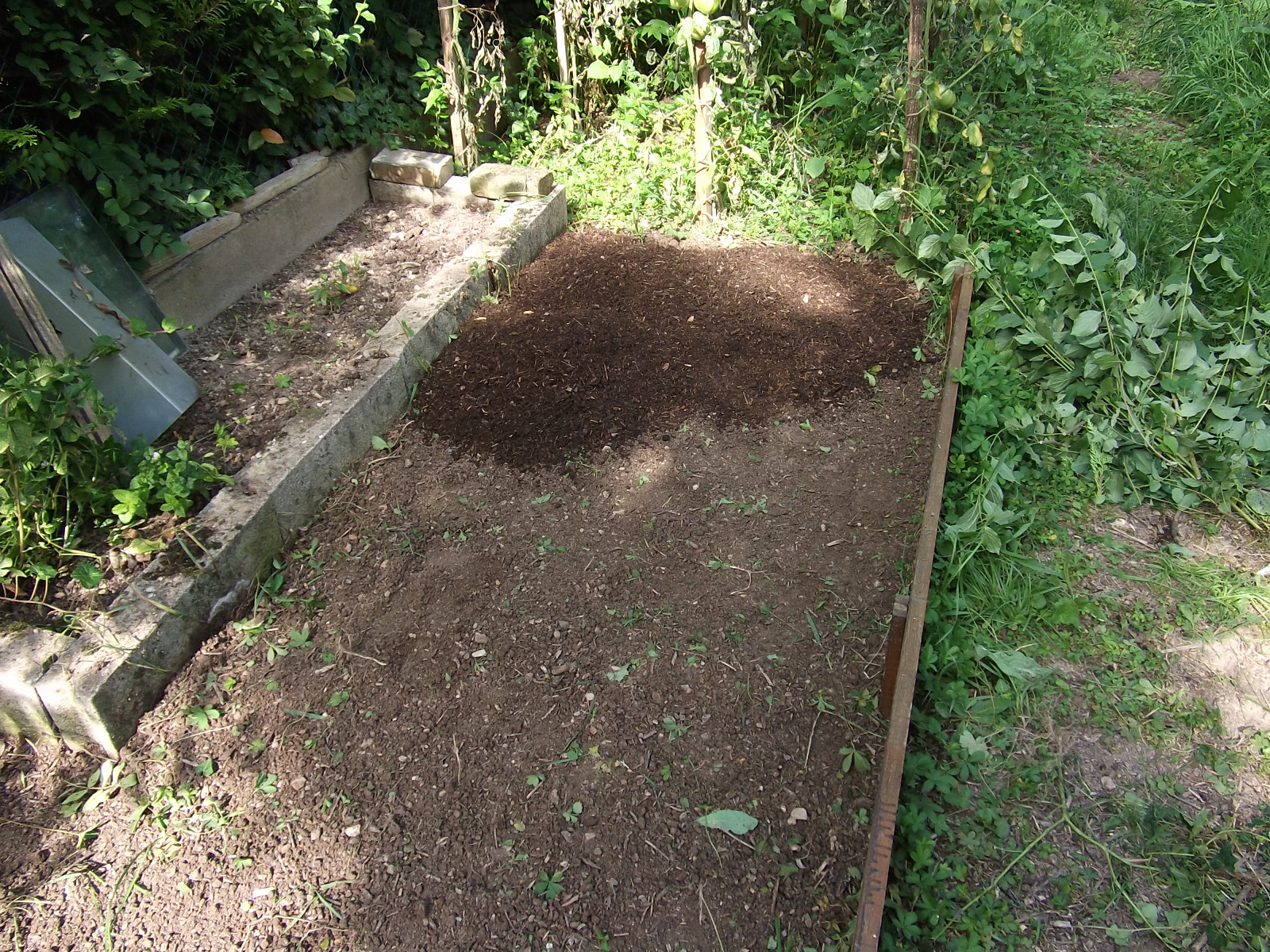 Hier, j'ai désherbé une partie du jardin, tamisé du composte mûr et je l'ai répendu sur le futur emplacement du tunnel.