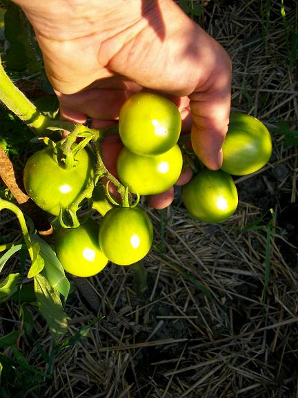 j'enlèves (un truc appris chez eric 34, un producteur de serres ) toutes les feuilles du bas, jusqu'au-dessus des premiers bouquets . les feuilles restante font office de tire-sève , ainsi les fruits du dessous grossissent beaucoup plus vite! etc.etc. en suivant la croissance et la récolte!