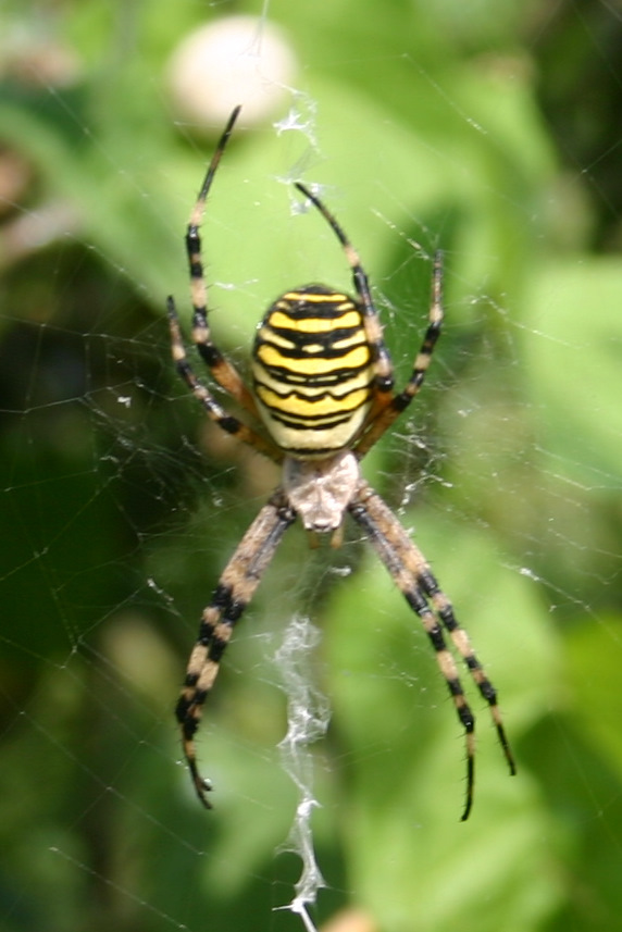 Monarde ton araignée est une épeire faciée (Argiope Bruennichi). On peut voir sur sa toile un ruban de soie (stabilimentum) servant à renforcer la toile