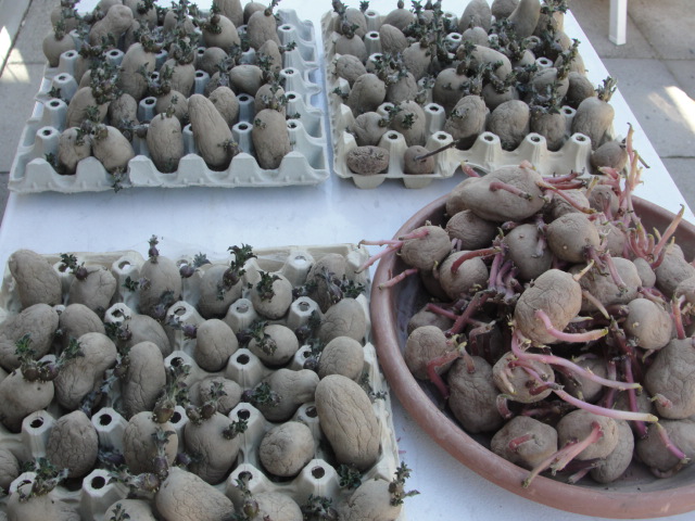 96 tubercules d'Amandine mis à germer derrière une fenêtre plein N depuis deux mois