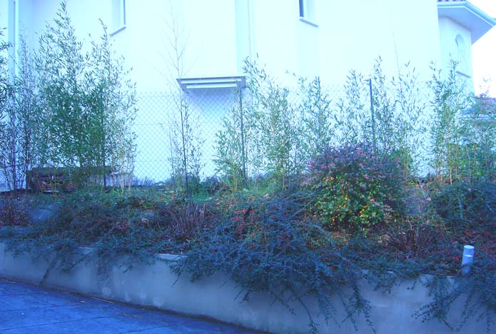 Et dans la partie plus élargie et en pente (voir photo), à la place des cotonéaster, je souhaite mettre qqs pittosporum tobira nanum (que j'ai ailleurs dans le jardin) et qui seront donc aux pieds des bambous.