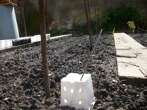 un peu de sang pour qu'il pousse vite , du grain bleu pour les limaces et un petit abri fait avec son pot pour faire des semis de salades, je prendrai des bacs à glaçons, les petits carrés sont bien fait pour !
