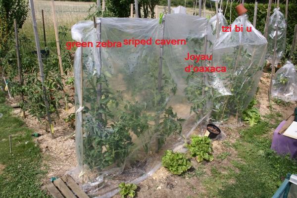 Plants arrachés à cause du Mildiou : Copia, hillbilly, berkeley tie dye, cote st andré. Plants très amputés (au dessus du 1er bouquet.) Chair de bœuf précoce, Jersey devil, Jérusalem, Black plum, purple russian, belle maurinoise