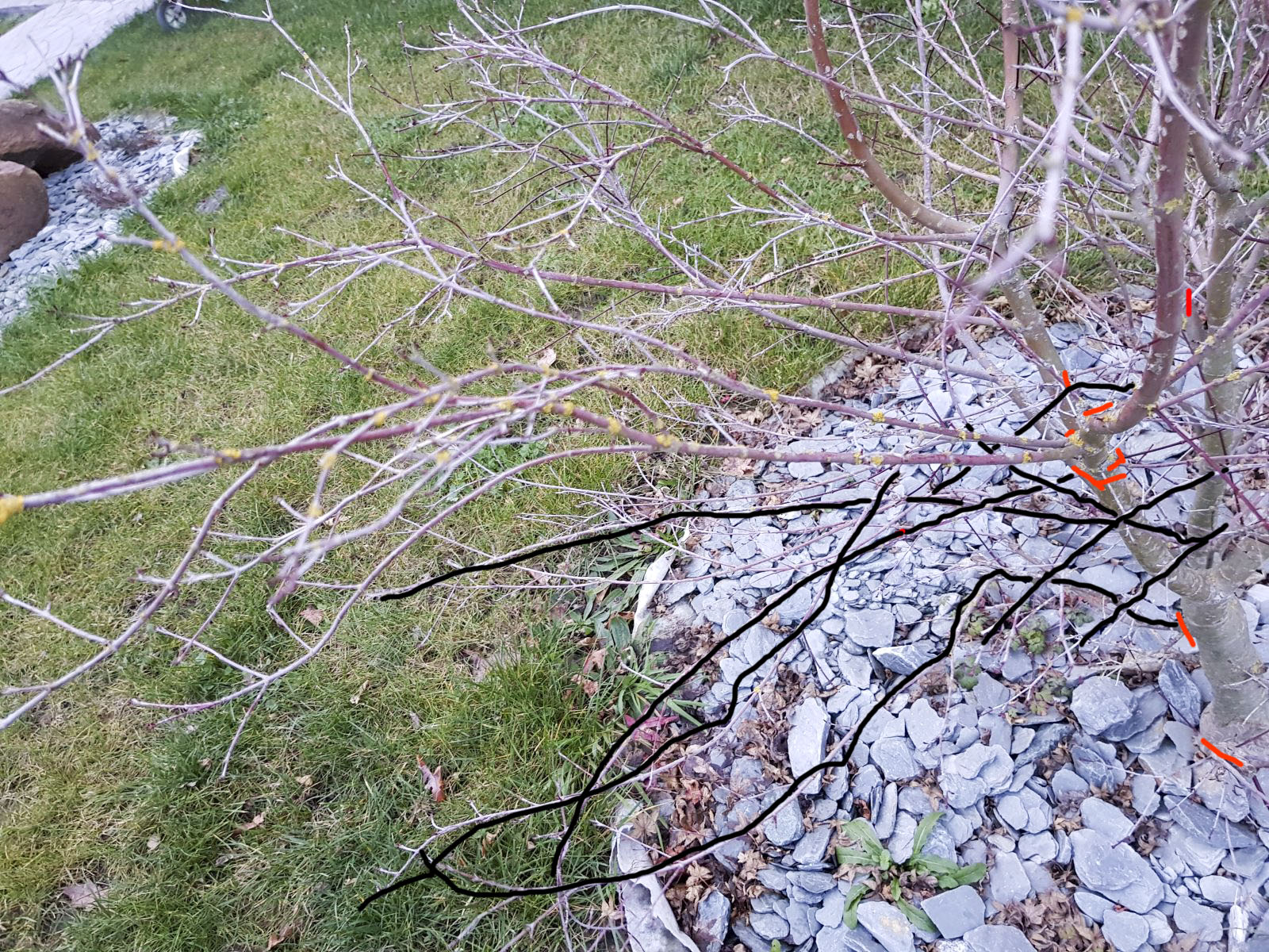 J'ai marqué en rouge quelques brindilles sur les troncs , il faut les couper ras. Là aussi je ne peux pas toutes les marquer, ce ne sont que quelques exemples. (Il y a une branchette tout en bas qui pousse sur le bourrelet de la greffe, il faut la couper. C'est le trait rouge le plus bas).