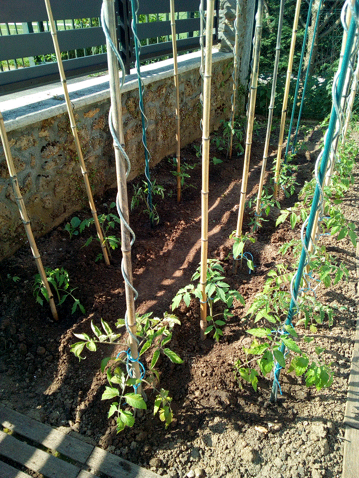 Une vue générale du 6 mai. Toutes les tomates sont en terre sauf un pied de cerises.