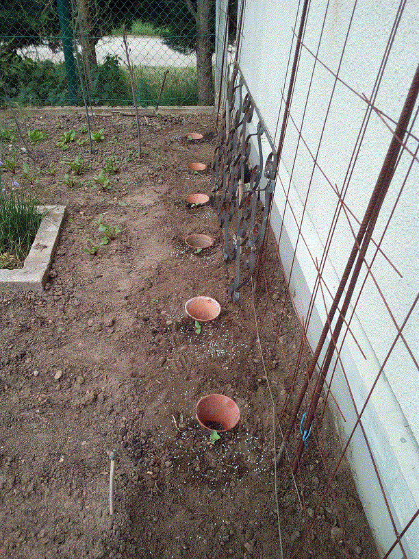 Courgettes, potimarrons et butternuts ont été plantés, ici les concombres et melons petits gris de Rennes, j'ai piqué l'astuce des pots à Marcol