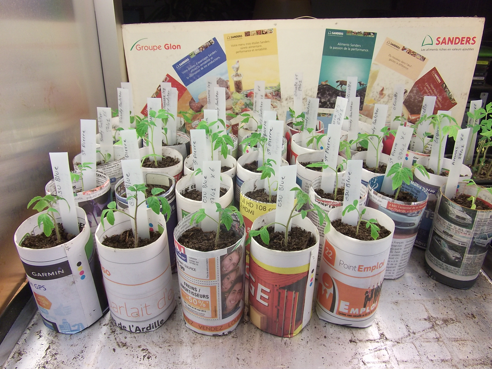 J'ai commencé le repiquage avec des pots en papier de 9 cm de haut. Ca me permet de les repiquer jusqu'aux feuilles. D'autres ont déjà été repiqués en pots plastique.