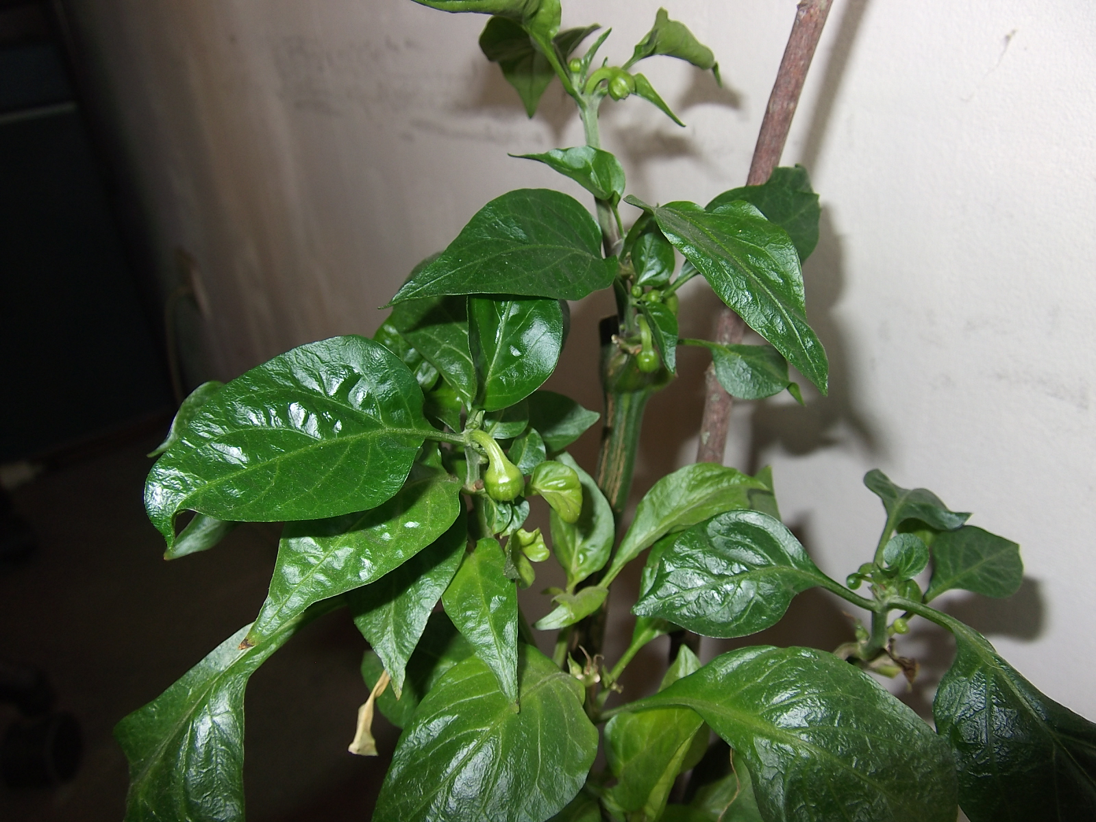 Un plant de poivrons de l'année dernière que j'ais rentré pour l'hiver et qui m'a donné quelques petits fruits en intérieur.