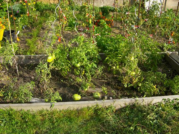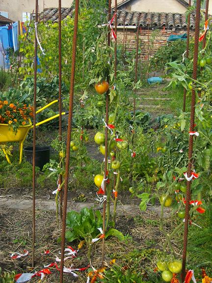 sur ce coin ci j'ai arraché quelques plants, de mi-saison,qui ne présentaient plus aucun intéret . sur ce qui reste, 1m80 tout de même , c beau. les "mrs kennedy" ( noire) donnent toujours très bien chez-moi! des bouquets de +- 6/8 fruits et un sacré grand nombre de bouquets ( 10 mini)! et là pour finir , les "sauvageonnes ", des plants autosemés, qui donnent tardivement!j'ai mis des planchettes pour que les tomates ne soient pas sur le sol! @+