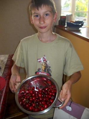 en attendant je lui ai préparé une surprise!! avec ma sœur, nous avons cueilli des cerises, pleins 2 paniers! et là c pour lui.