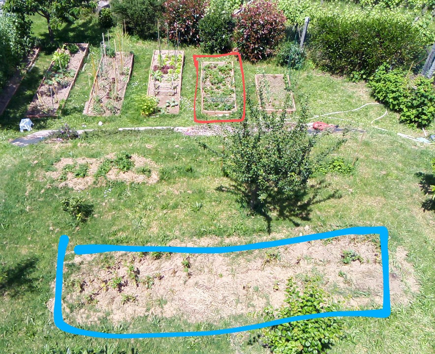 J'aimerais avoir votre avis:mes fraisiers ( en rouge sur la photo) sont en plein soleil une grande partie de la journée, cette année, ils sont un peu sec et surtout, il y a un nombre incalculable de galeries en dessous, les racines sont soulevées et ça ne donne rien de bien. A part ça, j'ai fait une nouvelle parcelle ( en bleu sur la photo) qui se trouve entre les arbres encore jeunes, donc a mi ombre.