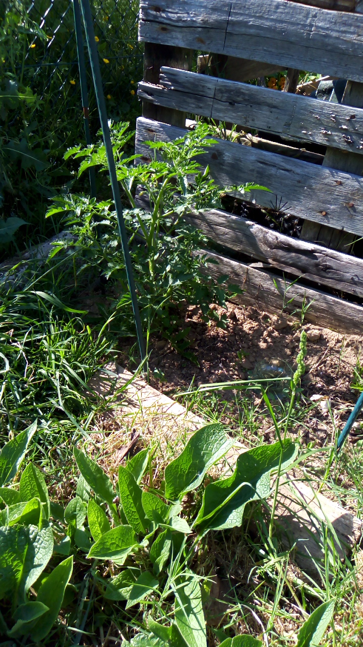 Question 1: j'ai acheté un sac de granulés de fumier de poule et de son de riz. Apparemment c'est du 3-3-3. Mais j'y connais rien, je sais pas ce que ça vaut. Vous comprenez QC a l'étiquette ? C'est en espagnol, portugais et anglais par contre... Question 2: normalement j'enlève les gourmands des tomates, mais j'en ai 4 qui m'ont fait une double branche, c'est pas vraiment un gourmand, je laisse faire, je ne vais pas couper vu la taille, mais savez-vous pourquoi ça fait ça? Et j'ai aussi quelques fleurs qui font la tête de chat, je crois qu'on dit comme ça, une grosse fleur toute dodue, je sais qu'il y a une raison mais je ne sais plus laquelle Et en vrac, courgettes, concombre ( ou cornichons je ne sais toujours pas... Et une tomate cerise entre la consoude et le compost, elle se porte bien!