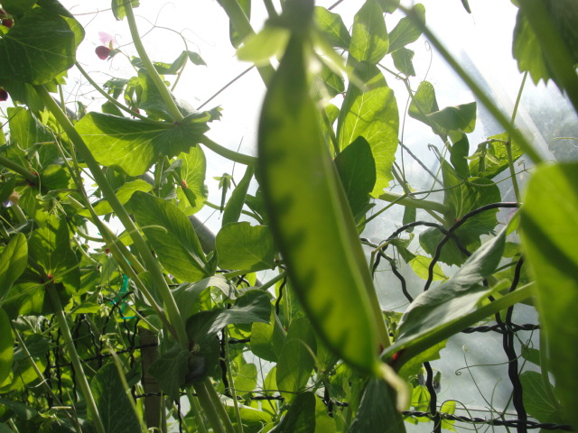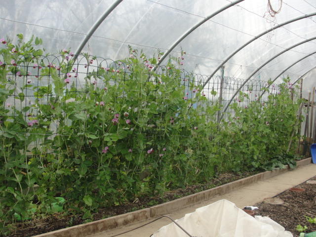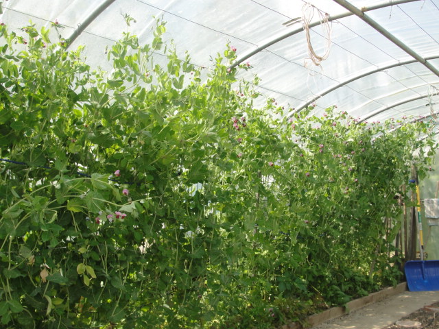 - les pois iraient jusqu'au faîte du tunnel à 200 cm, justement ce qu'exige cette variété, ce qui les aiderait à rester bien verticaux (plutôt qu'à verser sur la tête du jardinier)