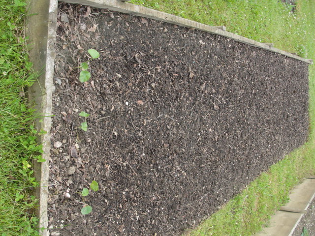 Après 7 mois de lente digestion (novembre à mai), il ne restait plus grand chose sous le Bidim. Un coup de râteau a suffi pour enlever les restes de feuilles et les qq herbes qui avaient réussi à s'installer sur les bords. J'ai ensuite ajouté 1 cm de compost.