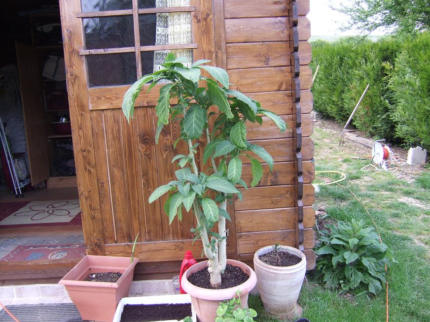 J'ai recommencé à sortir mon brug mais un peu moins longtemps au soleil. Une tit' photo pour vous le montrer. L'été dernier il mesurait environ 2,20 m. Je ne pensais pas qu'il redémarrerait et le voilà.