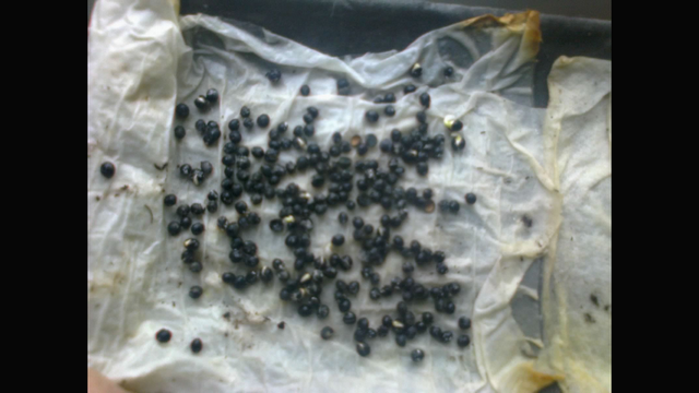 Dés que je vois les premières baies qui s'ouvre je récolte tout ,comme je suis dans le midi ,j'étale tout au soleil et le soir tout est ouvert. Quand on commence à en avoir une grosse quantité ,il est plus facile de trier; en remplissant un grand récipient ,et en l'agitant en faisant des cercles et en tapant un peu, les graines restent au fond, on écope le dessus, qui et pratiquement trié. On recommence jusqu’à épuisement de la récolte, et tant pis si on en perd un peu.