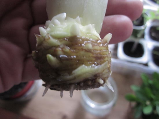 Cela fait maintenant 15 jours et de petites racines sortent, le coeur est parfaitement vert, juste quelques feuilles se dessèchent aux pointes à l'extérieur, mais j'ai lu que c'était normal, parce que ces feuilles vont finir par sécher et tomber.