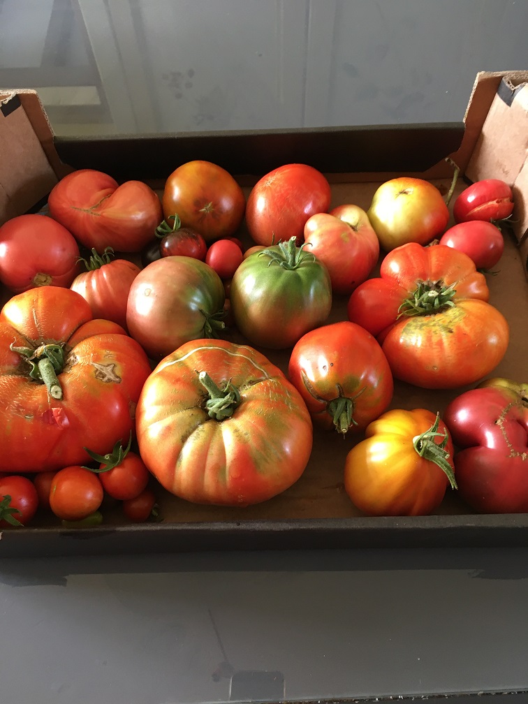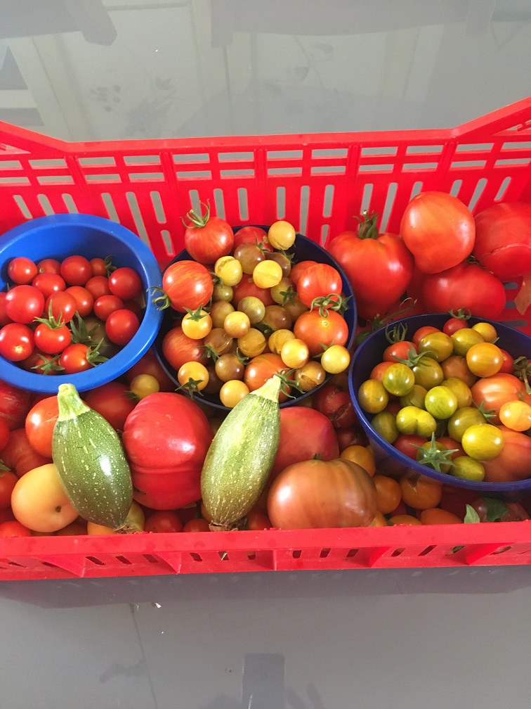 Beaucoup de tomates cerises..... Plein de couleurs. Ma voisine va être contente