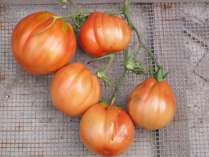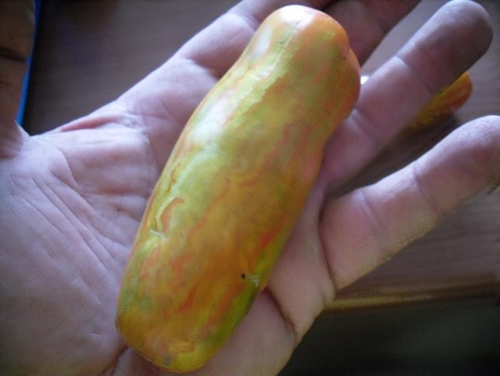 les pripakujulio triibuline, longue saucisse ,rouge rayée verte et jaune ( russie). plant déterminée , très productif. l'an passé j'avais taillé. cette annèe , pas du tout et les plants sont "kafis "de tomates!! :top: