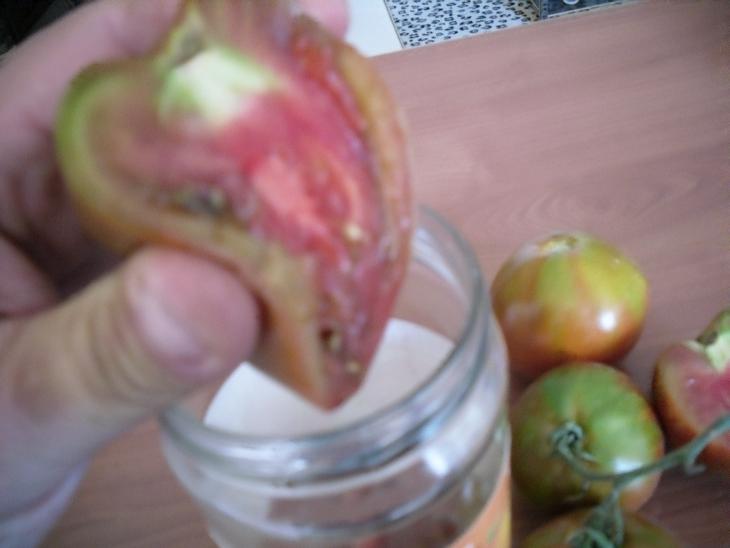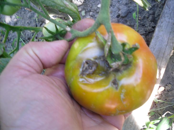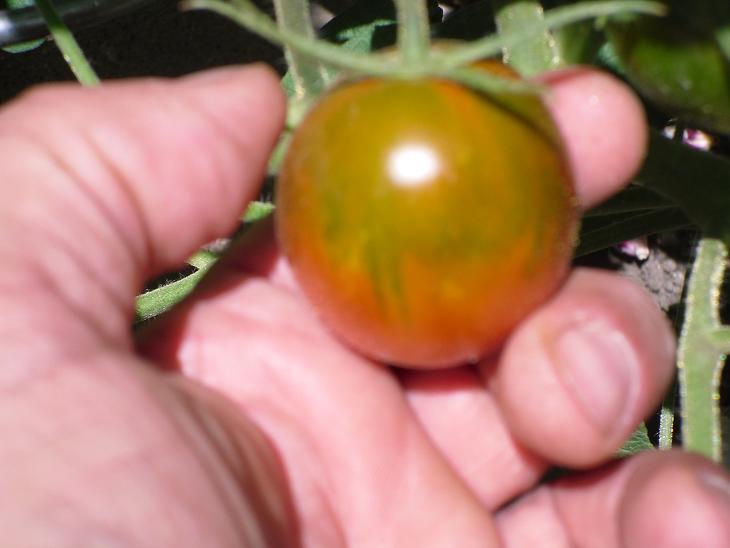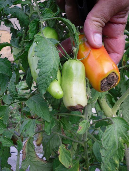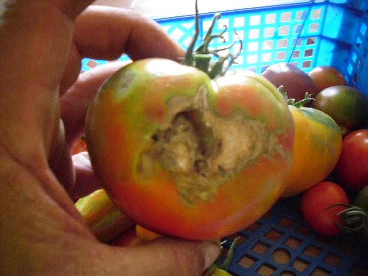 là j'ai remarqué cet après-midi, une tomate impactée par un grêlon. le fruit pourrie de l'intèrieur. dommage. il était bien joli. :cry: