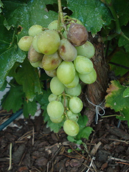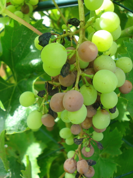 La feuille à une un coup de chaud, sur la tige il s'agit d'oïdium et sur les grappes c'est du black-rot. Il est maintenant trop tard pour traiter ces maladies ce traite en préventif.