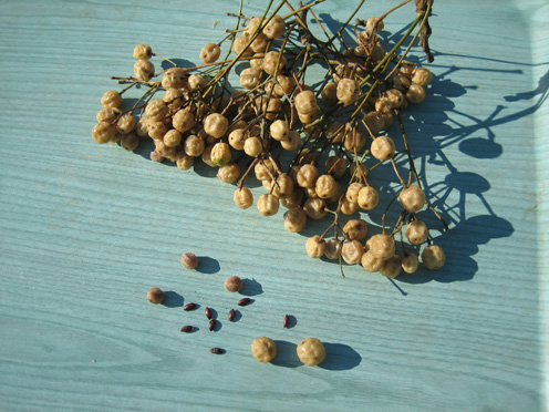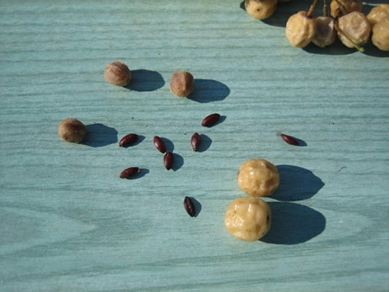 Bonjour, voici des fruits, coques et graines de melia azedarach. Les fruits sont mûrs l'hiver et restent sur l'arbre jusqu'au printemps. Les coques st très difficiles à casser car les graines st fragiles et se brisent au moindre choc!