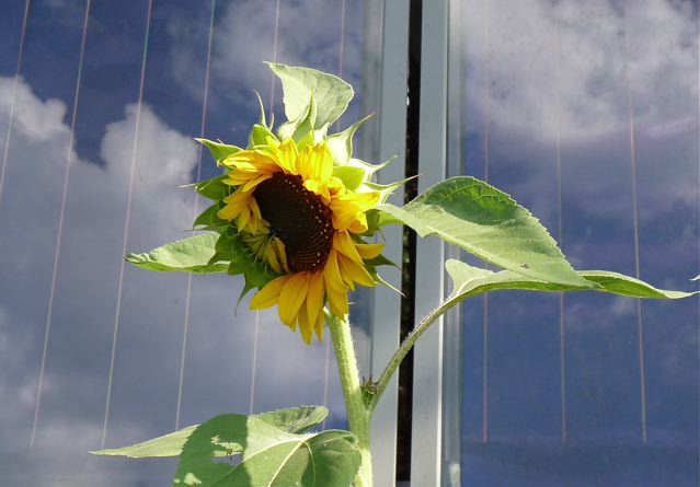 Nous avons des panneaux solaires pour l'eau chaude et le chauffage. Cette année, j'ai mis une rangée de tournesol devant les panneaux pour faire joli...