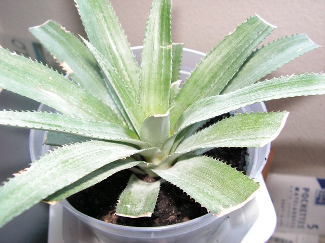 Hier, j'ai acheté un nouvel ananas au feuillage bien vert. J'ai étêté, effeuillé le bas et mis la base dans un bocal d'eau de façon à ce qu'elle trempe en permanence. Déjà ce matin, j'ai remarqué une évolution négative dans le bord des feuilles. Elles brunissent déjà. C'est effrayant chez moi, la vitesse à laquelle ce type de plantes peut se dèssécher. Je saisis mal pourquoi.