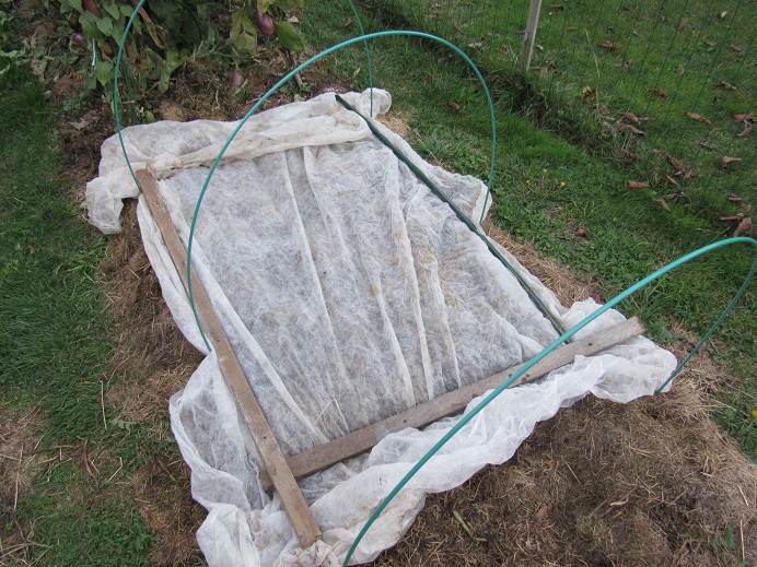 Le tunnel n’accueillera donc aucune culture cet hiver :cry: . Il va donc falloir que je cultive mes salades d'hiver à l'extérieur :| . Pour cela j'ai prévu d'occupé la planche qui a accueillie les courgettes durant la belle saison. Sur cette planche j'ai posé des arceaux tous les 50 cm,il seront recouverts de P17 voir plus au fil de l'avancé dans l'hiver.