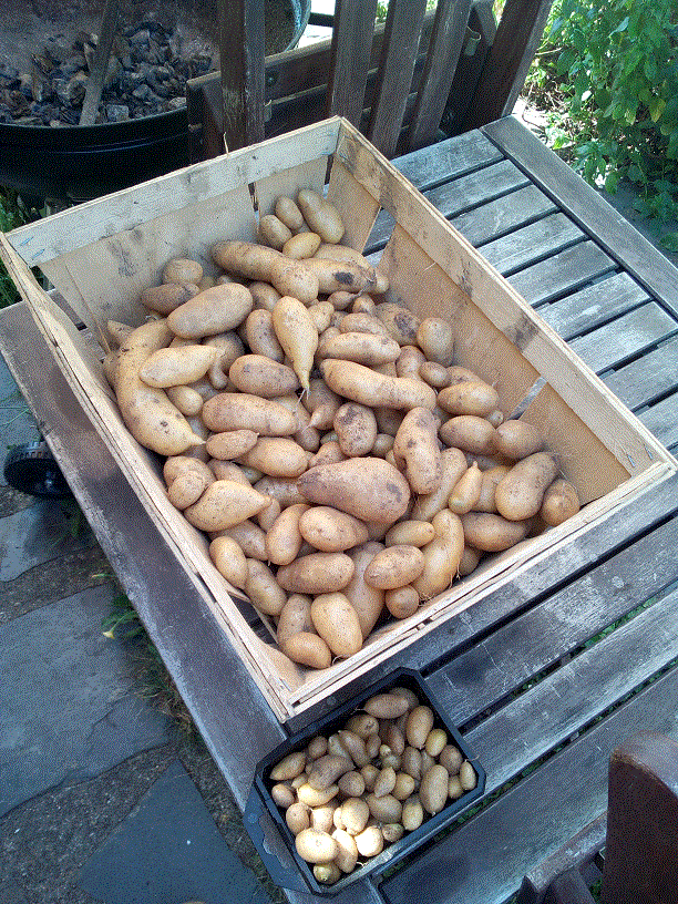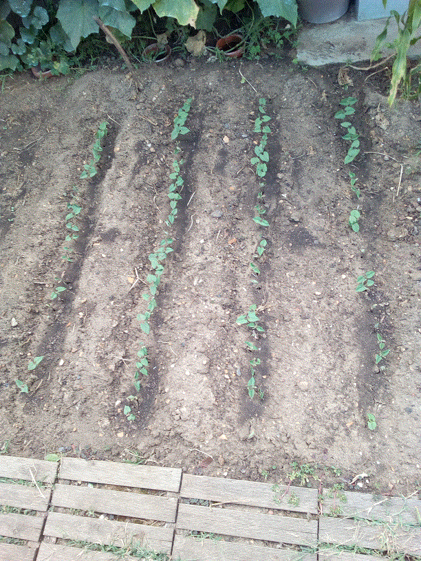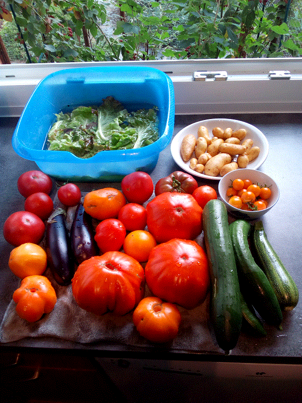 Récolte de samedi matin, en mangeant un concombre midi et soir, j'ai encore une dizaine de concombres au frigo. J'ai arraché les deux dernières lignes de rattes (Un peu plus de 3 mètres), 4,5 kg, on a pas fini d'en manger... Les haricots vont bien, la photo date de samedi, et ils ont bien poussé depuis.