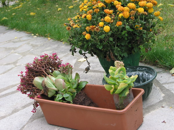 un chysanthème à pompom, un kalancoe et une inconnue plus des pots et jardinières et même quelques graines de roses tremières